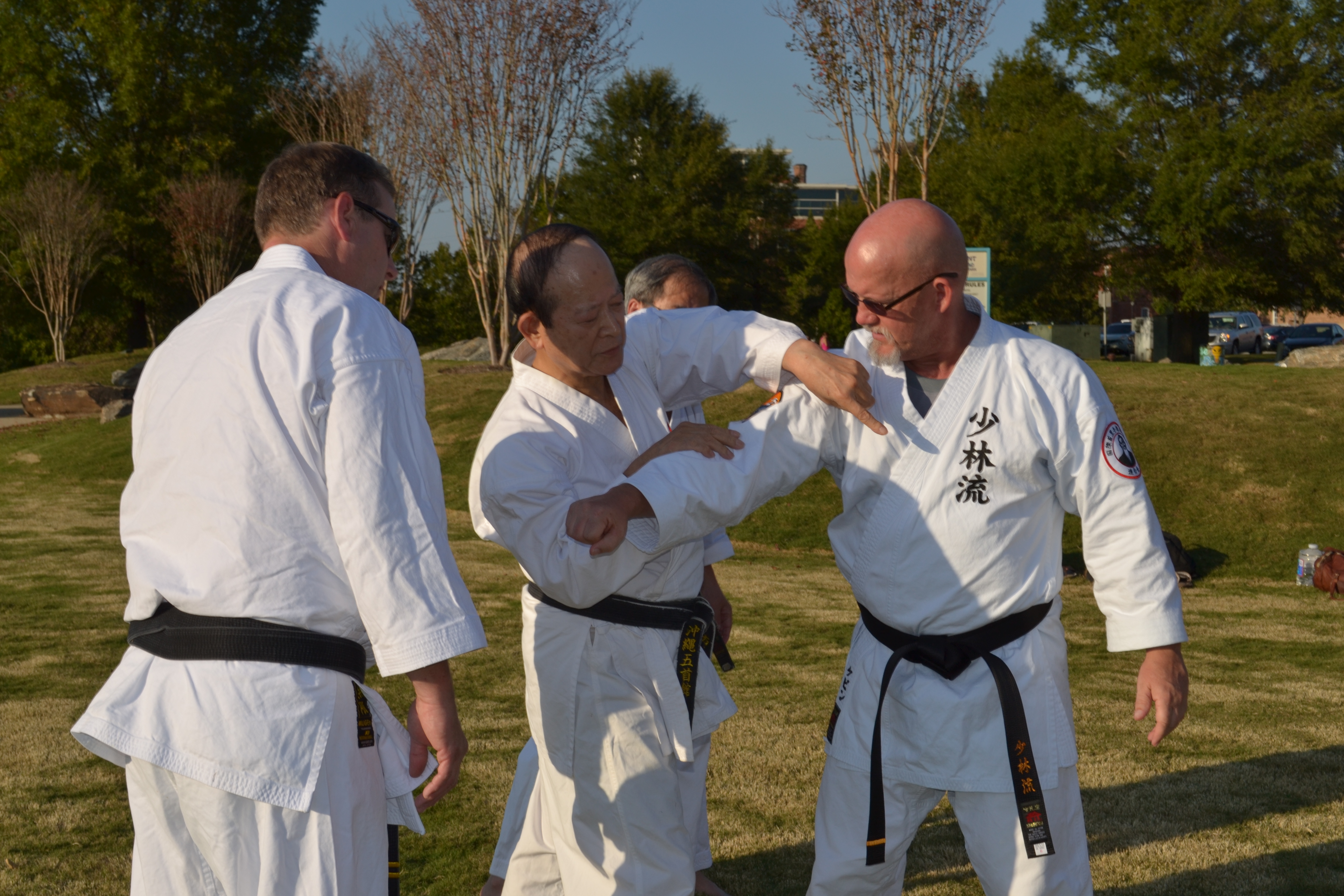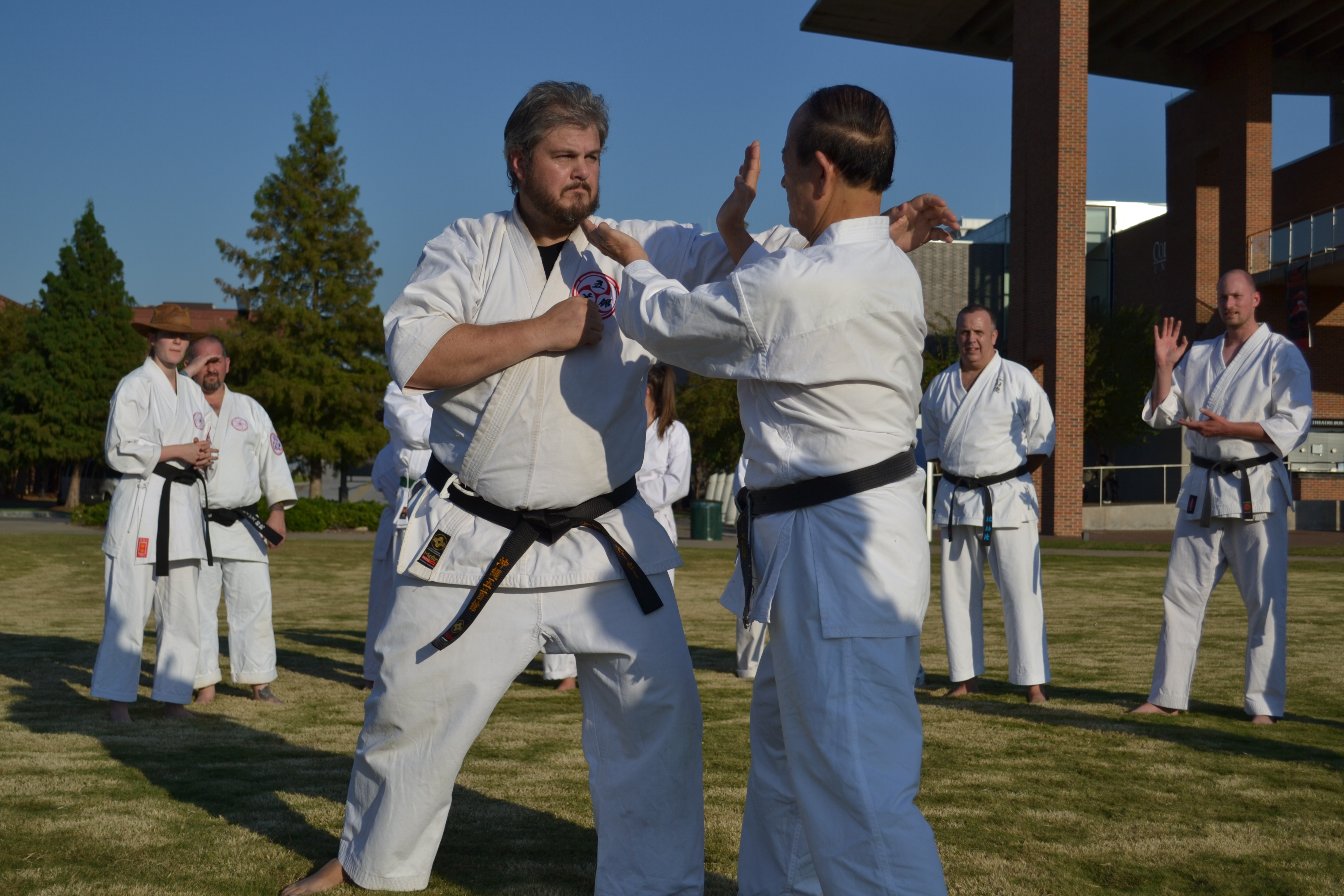 But that’s just me, I’m a physical learner, and physical learning often comes with growing pains; that is- bumps, bruises, the occasional bloodshed, joints and nerves on fire from being twisted and turned, etc. These ‘growing pains’ are the direct result of application based training, and this type of active contact training will teach us more than any theoretical practice can ever hope to achieve. We have all been to those gasshuku, seminars, camps, workshops, etc. where the featured instructor(s) will teach a kata or two, and then teach the bunkai to everyone via one uke (willing partner) as a demonstrator. It all looks great, (and somewhat choreographed) but in the back of your mind, you can’t help but wonder if it really works against an unwilling opponent. And it’s ok to be skeptical regarding personal protection and defense; in fact, I fully expect to be challenged when teaching something new or different to students, peers, or other instructors. This keeps everyone honest. My teacher has a great way to address those that are respectufully curious or skeptical; when asked a certain detail or question (the ‘what if’s’) Takamiyagi Sensei simply responds: “Come, you try”. This is followed immediately by a quick physical (and sometimes painful) lesson that leaves no further doubt or questions in the mind of the inquirer.